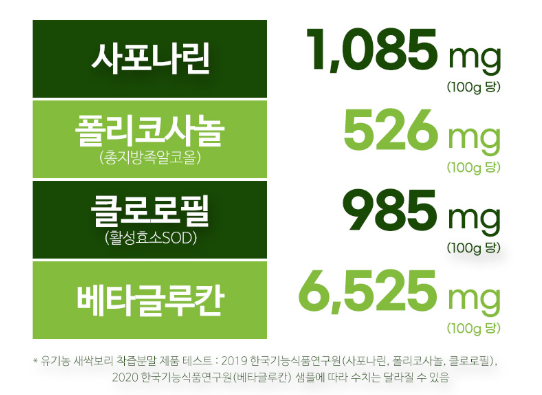 유기농 새싹보리 착즙분말의 주요 성분은 사포나린, 폴리코사놀, 클로로필, 베타글루칸이고 또한 새싹보리에는 45종의 다양한 영양성분이 들어있습니다.