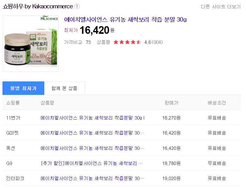 '에이치엘 사이언스 유기농 새싹보리 착즙 분말'을 검색하시면 됩니다. 제가 검색해보니까 30g(1달치) 기준으로
