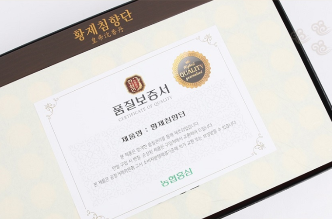 황제침향단은 외관도 매우 고급스럽고 침향단도 각각 개별로 플라스틱 통에 들어있어서 부모님이나 지인들에게 선물용으로도 좋을 것 같다는 생각이 들었습니다. 상자를 열어보면 바로 보이는 품질보증서가 한번 더 신뢰감을 주는 요소이구요!