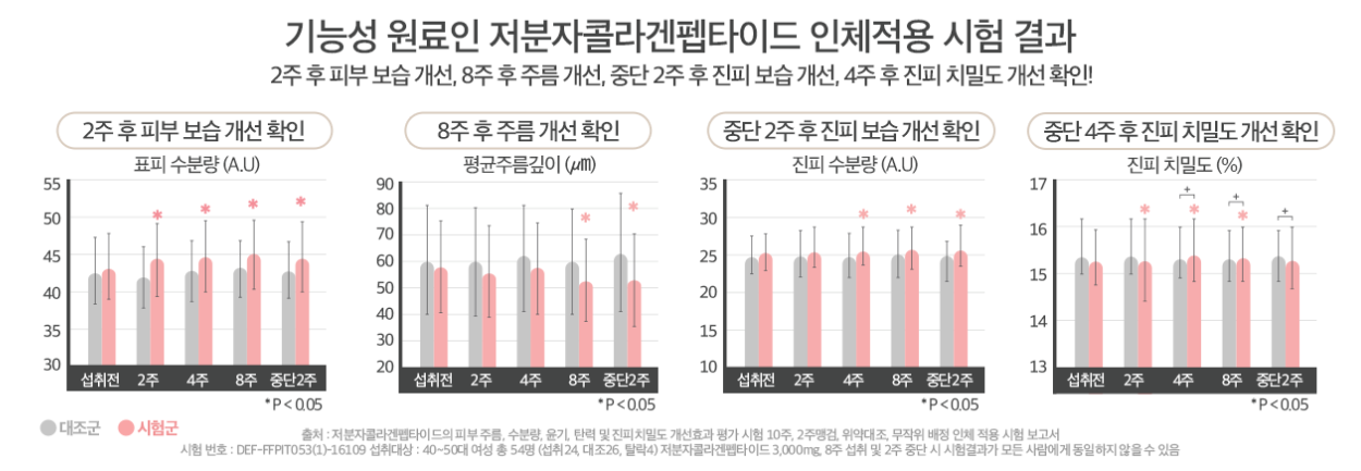 아래 자료는 저분자콜라겐펩타이드 인체적용 시험의 결과인데요, 피부 보습, 주름의 개선이 확인된 것을 확인 할 수 있었습니다.