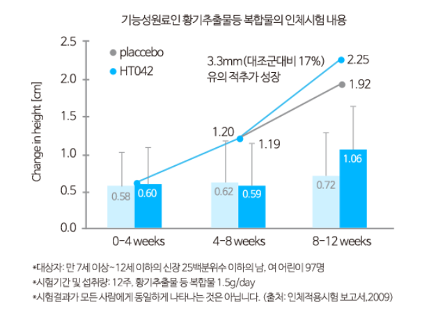 아래 자료는 기능성원료 황기 추출물 등 복합물의 인체적용시험 결과로 대조군과 비교해 17%에 유의적 추가 성장이 확인됨을 알 수 있었습니다.