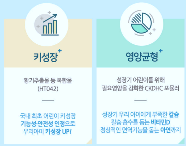 요즘 같은 환절기, 코로나19 바이러스의 지속으로 면역력 관리에 다들 많은 관심을 가지고 계신 것 같습니다. 아이들의 면역력이 떨어지면 감기 등 잔병치레에 잘 걸리게 되고, 우리 몸은 아픈 곳이 생기면 그 부분을 회복하기 위해 온 힘을 쏟게 되므로 아이들의 경우에는 키 성장에 필요한 영양과 에너지마저 빼앗기게 될 수 있습니다. 아이커는 추가적으로 키 성장에 도움이 되는 성분 뿐만아니라, 영양균형에도 도움을 줄 수있는 CKDHC 포뮬러를 추가하여 영양과 면역까지 챙길 수 있는 제품이에요!