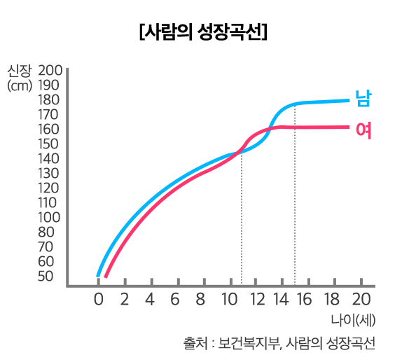 대부분의 부모님들은 '시간이 지나면 크겠지' 하고 내버려두는 경우가 많으신데요, 문제는 키가 클 수 있는 시기는 따로 정해져 있다는 점입니다. 여자는 보통 15~18세, 남자는 18~21세에 성장이 멈추게 됩니다. 게다가 이러한 성장 시기는 개인마다 편차가 크기 때문에 더욱 빠르게 성장이 멈출 수도 있습니다. 한 번 지나간 성장기는 다시 돌아올 수 없기 때문에 일찍부터 아이들의 성장에 관심을 기울여 꾸준히 관리해주는 것이 좋습니다.
