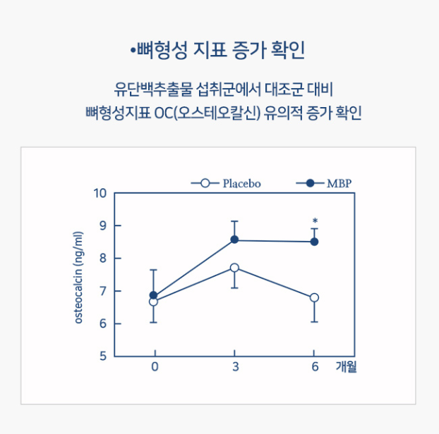 MBP의 인체적용시험 결과를 살펴보면 골밀도의 증가, 개선 그리고 뼈형성 지표의 유의적 증가되었고, 뼈 파괴 지표인 DPD와 NTx는 감소된 것을 확인할 수 있었어요.