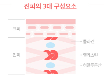 우리의 피부는 표피와 진피로 나누어져 있습니다. 진피는 표피의 약 10~40배 가량의 두께로 피부의 90% 이상을 차지하고 있어요! 진피층은 또 콜라겐과 엘라스틴 그리고 히알루론산 이 세 가지의 구성요소로 이루어져있는데 각각 다른 역할을 하고 있습니다.