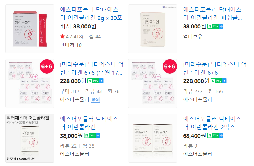 여에스더 어린 콜라겐은 현재 2g x 30포 1박스 기준으로 38,000원 정도의 가격대가 형성되어있는데 에스더몰 공식 홈페이지에서 6+6 이벤트로 228,000원에 판매하고 있었어요!