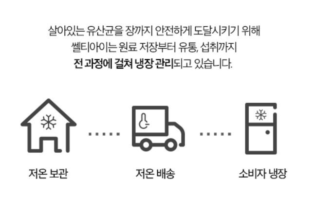 건강기능식품이라면 제품의 안정성을 꼭 살펴보게 됩니다. 셀티아이 유산균은 식약처로부터 제품의 안정성과 기능성을 인정 받고, 우수건강기능식품 제조 기준 적합 판정을 받은 GMP 인증 제조시설에서 만들어졌다고 해요. 뿐만 아니라 고온에 약한 유산균을 보호하기 위하여 원료 저장부터 유통, 섭취까지 전 과정에 걸쳐 냉장 관리하여 배송을 해준다고 합니다!