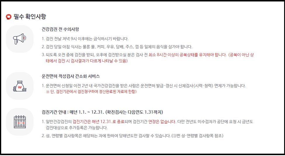 - 되도록 오전 중에 검진을 받되, 오후에 검진받으실 분들은 검사 전 최소 8시간 이상의 공복 상태를 유지해야 합니다.