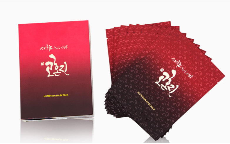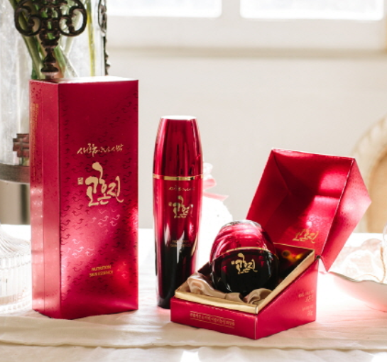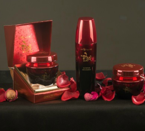 고혼진은 왼쪽부터 뉴트리션 크림, 뉴트리션 스킨 에센스, 마스크팩 등의 뷰티 제품을 선보이고 있습니다.
