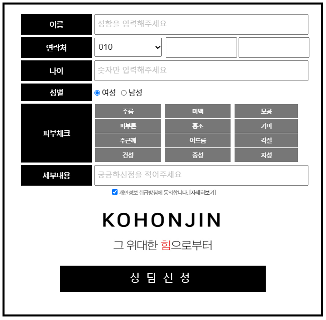 고혼진 화장품 가격은 우선 가격대가 고가로 형성되어 있다고 말씀드리고 싶습니다. 정확한 가격은 회사 방침 상 제맘대로 공개적인 곳에 오픈할 수 없도록 되어 있었어요ㅠㅠ. 때문에 고혼진 화장품의 가격을 알기 위해서는 고혼진 공식 홈페이지로 들어가셔서 이름, 연락처, 나이, 성별, 피부체크 등의 간단한 내용을 기입하시면 상담원이 가격을 안내해주고 있습니다.