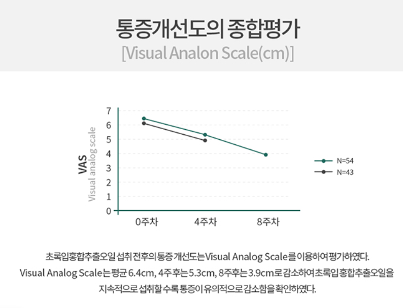 7개 대학병원에서 관절이 불편한 43명의 성인을 대상으로 초록입홍합추출오일을 8주간 섭취하게 하였는데요, 아래와 같이 통증개선도에 유의미한 변화가 나타난 것을 확인할 수 있었습니다.