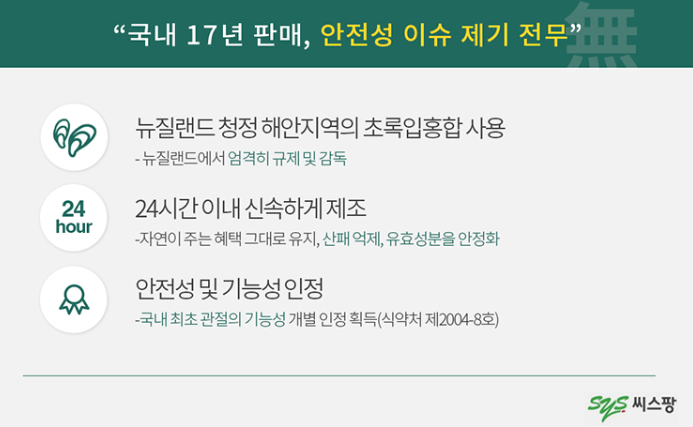 씨스팡 관절팔팔은 초록입홍합 추출물을 만들 때 유효한 성분이 파괴되지 않도록 동결건조 방식을 이용하였고, 신선도를 위하여 24시간 이내에 신속하게 제조하였다고 해요. 국내에서 17년간 판매해오면서 안전성에 대한 문제 제기가 전무했다고 하니 안심하고 섭취할 수 있는 것 같아요!