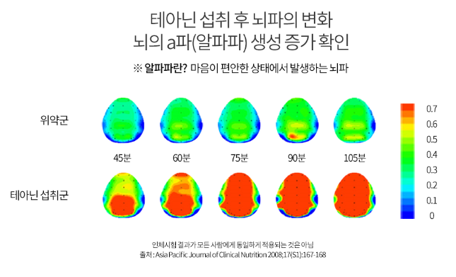 L-테아닌의 인체적용시험 결과 테아닌을 섭취한 군에서 마음이 편안한 상태에서 발생하는 뇌파를 뜻하는 알파파의 생성이 증가 되었다고 해요!