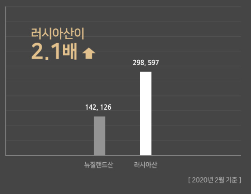 위의 자료를 보시면 러시아산 녹용이 뉴질랜드산 녹용에 비해 2배나 높은 가격에 수입이 되는 것을 확인할 수 있는데요,