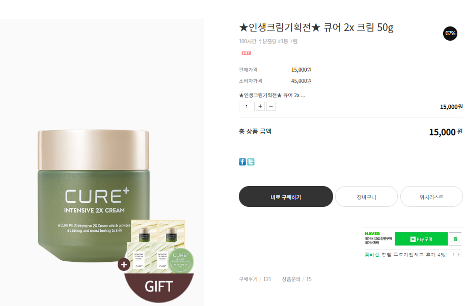 김정문 알로에 큐어크림은 현재 공식 홈페이지에서 50g 한 통 기준으로 15,000원에 판매하고 있었어요! 홈페이지 들어가보니 최근 큐어 배리어 릴리프 크림이 출시되었더라고요! 배리어 릴리프 크림은 큐어크림과 다르게 크림타입 제형으로 되어 있었어요!