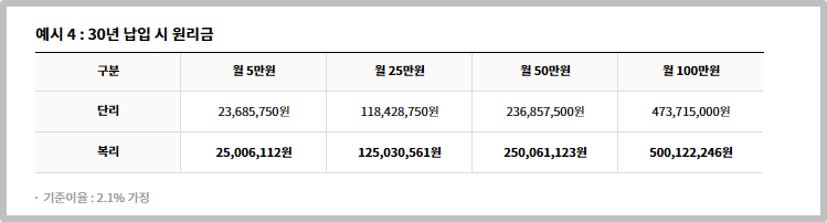 공제금은 별도 사업비 차감 없이 납입부금 전액에 연 복리이자를 적용하여 적립되므로 목돈마련에 유리합니다. 장기 가입자에게 유리한 혜택입니다. 월 100만 원 납입 시, 2.1% 기준 이율로 계산해보면 단리는 473,715,000원, 복리는 500,122,246원입니다.