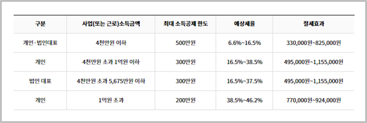 납입부금에 대해 연간 최대 500만 원의 소득 공제 혜택이 부과하게 되는데요, 개인ㆍ법인 대표 중 연간 소득금액이 4천만 원 이하라면 최대 소득공제 한도가 500만 원이고, 예상 세율은 6.6%~16.5%입니다. 더욱 자세한 사항은 아래 표를 확인해보시면 좋을 것 같습니다.