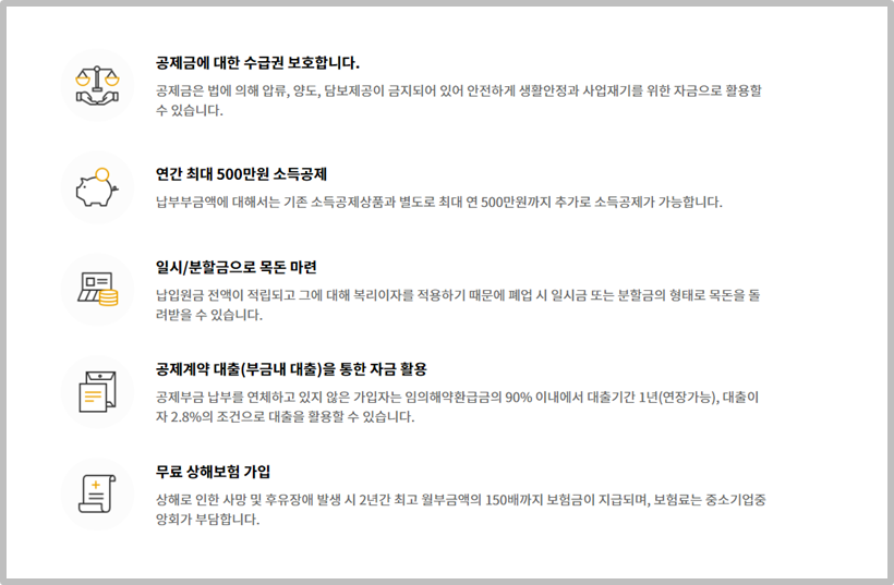 - 목돈마련 : 납입원금 전액이 적립되고 그에 대한 복리이자를 적용하기 때문에 폐업 시 일시금 또는 분할금의 형태로 목돈을 돌려받을 수 있습니다.