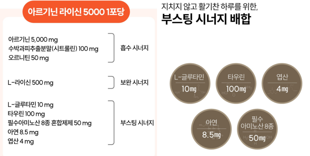 마지막으로 아르기닌은 피로 회복에 도움을 줘요. 아르기닌이 혈액 순환을 개선하고 에너지 생성에 기여해서 우리 몸이 더 빨리 회복할 수 있게 해줘요.