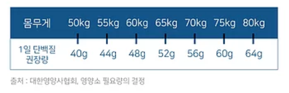 단백질은 매일 하루 권장 섭취량만큼 섭취해주는 것이 중요한데요, 단백질의 하루 권장 섭취량은 몸무게 1kg당 1g로, 60kg의 성인 남성 기준 48g~60g 정도의 단백질을 섭취해주는 것이 좋습니다. 하지만 우리의 일반 식습관으로는 매일 단백질 권장량을 섭취하기에는 어려움이 있습니다.