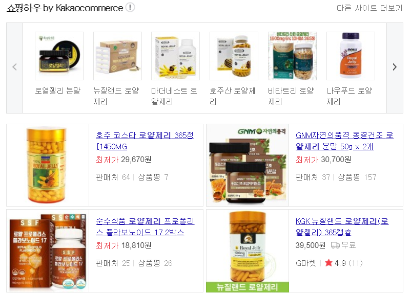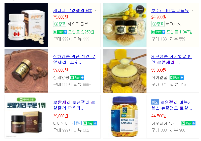 로얄제리는 온라인 상에서 쉽게 구매하실 수 있습니다. 네이버나 다음과 같은 포털사이트에 로얄제리를 검색하시면 되는데요 로얄제리의 가격을 제가 알아보니까 분말 50g 기준으로 15,000~50,000원 정도로 가격이 천차만별이었어요. 분말, 캡슐, 생 로얄제리 다양한 제품이 나와있고 제품마다 성분이 조금씩 다르니까 위에서 말씀드린 제품 고르는 법을 참고하셔서 좋은 제품 고르시길 바랍니다.