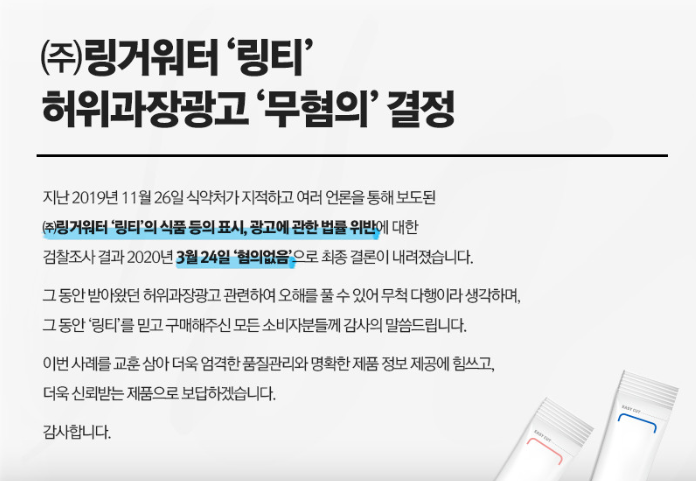 링티는 작년 말에 허위 광고 논란으로 한창 떠들썩했었는데 올해 3월 "혐의 없음"으로 결론이 내려졌다고 하니 안심하고 드셔도 될 것 같습니다.