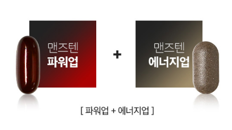 맨즈텐은 한 포에 두 정의 알약이 들어있습니다. 한 정은 남성의 파워에 중점을 둔 파워업이고 에너지 대사와 생성에 도움을 줄 수 있는 에너지업이에요!