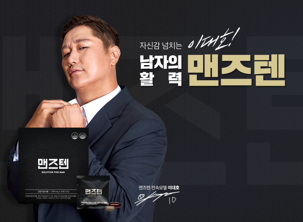 맨즈텐은 전속모델로 이대호씨가 활동 중인 제품으로 남성의 신체 건강, 활력, 지구력 등에 도움을 줄 수 있는 제품입니다. 맨즈텐은 건강기능식품(토탈케어) 부문에서 대한민국 소비자 만족도 1위, 대한민국 우수 브랜드 대상을 수상하고 남성건강기능식품 부문에서는 한국브랜드선호도 1위와 대한민국 브랜드 만족도 1위를 수상한 제품이에요!