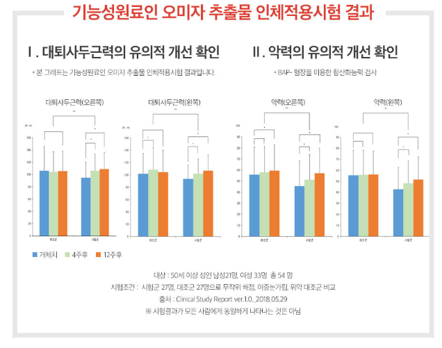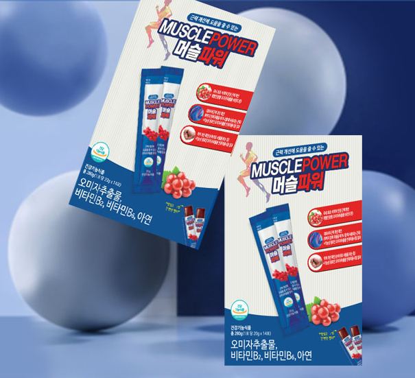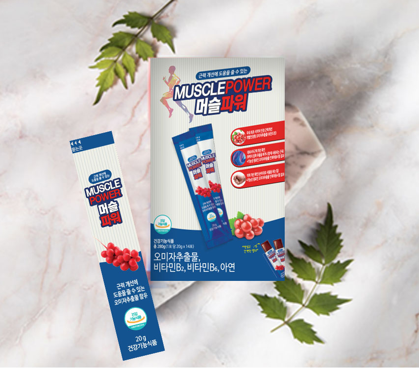 머슬파워는 주 성분으로 오미자 추출물(쉬잔드린)을 사용하고 있습니다. 100% 식물성 원료로 만들어진 오미자 추출물은 식약처로부터 국내 최초로 근력 개선 기능성일 인정받은 원료인데요, 실제로 기능성 원료인 오미자 추출물의 인체적용시험 결과 대퇴사두근력과 악력의 유의적 개선이 확인되었습니다.