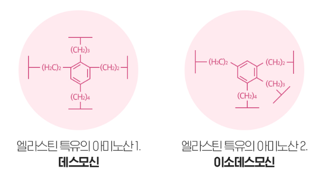 엘라스틴의 데스모신과 이소데스모신 성분은 엘라스틴이나 콜라겐 내에서 교ㆍ결합 역할을 수행하는 물질로써 엘라스틴의 아미노산 지표를 뜻하는데요, 셀티바 엘라스틴에는 데스모신과 이소데스모신이 자사 엘라스틴 함유 제품군 대비 최대 함량만큼 포함이 되었다고 해요!