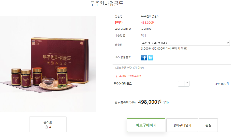 무주 천마정 골드는 현재 무주군약초영농조합법인 홈페이지에서 판매하고 있는데요, 250g x 4병 (1000g) 기준으로 498,000원의 가격으로 판매하고 있었어요! 글 작성 시기랑 글을 보시는 시기와 가격 차이가 날 수 있어요. 한번 더 검색해보시길 바랍니다!