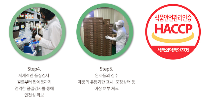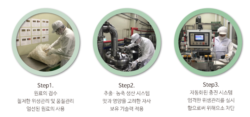 무주천마정골드는 제품을 생산할 때 원료 검수부터, 추출, 농축, 완제품 검수 까지 체계적인 품질 검사를 진행하고 식품의약품안전처로부터 식품안전관리인증, HACCP 인증을 받은 제조시설에서 만들어졌다고 하니 안심하고 섭취하실 수 있습니다.