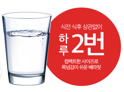 베라핏의 섭취 방법은 매우 간단해요! 평소처럼 식사하시고 식전 식후와 상관 없이 충분한 물과 함께 하루 2번 섭취해주시면 됩니다.