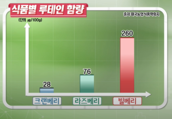 빌베리는 블루베리와 상당히 흡사하게 생긴 과일입니다. 빌베리는 2차 세계대전에서 영국 비행기 조종사들이 야간 비행을 위해서 챙겨먹었다고도 잘 알려져있습니다. 그 이유로는 루테인이 풍부하게 함유된 빌베리의 시력 개선 효능 때문인데요, 식품별 루테인 함량을 비교해보면 크랜베리에는 28µg, 라즈베리에는 76µg, 빌베리에는 260µg 으로 많은 루테인이 함유되어 있다고 합니다.