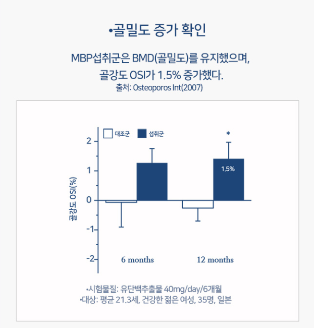 MBP의 인체적용시험 결과를 살펴보면 골밀도의 증가, 개선 그리고 뼈형성 지표의 유의적 증가되었고, 뼈 파괴 지표인 DPD와 NTx는 감소된 것을 확인할 수 있었어요.