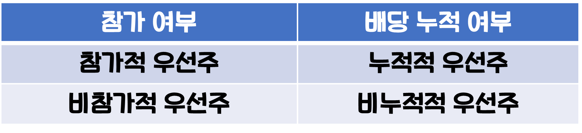 우선주는 의결권이 없는 대신 보통주가 가진 권리보다 우선하는 다른 권리를 가지는데요, 우선주는 배당, 잔여이익에 대해서 우선적 지위를 얻습니다. 즉, 보통주보다 먼저 배당금을 지급받게 되는 것인데요, 우선주 같은 경우에는 참가할 수 있느냐, 또한 누적적 배당이냐 이 두 가지 분류에 의하여 또 나눠지게 됩니다.