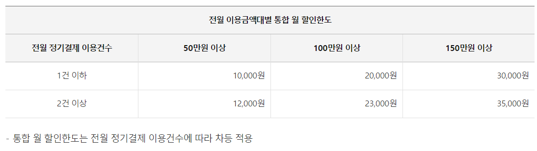 - 발급월+1개월까지는 전월 이용금액 50만 원 미만 시에도 50만원 이상~100만 원 미만 실적 구간 혜택 제공 (전월 이용금액 100만 원 이상 시에는 해당 실적 구간 혜택 제공)