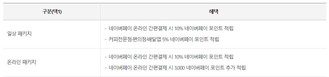 - 라이프스타일에 따라 ‘일상 패키지‘ 또는 ‘온라인 패키지‘ 중 선택 시 해당 패키지에 따른 적립 서비스 제공