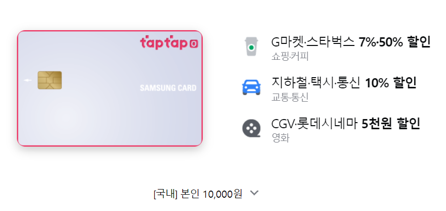 삼성카드 taptap O는 20, 30대의 사회 초년생들에게 많은 사랑을 받고 있는 신용카드입니다. 스타벅스 50% 할인 혜택을 주고 대중교통 10% 할인 및 영화 5천 원 할인을 제공하고 있습니다.