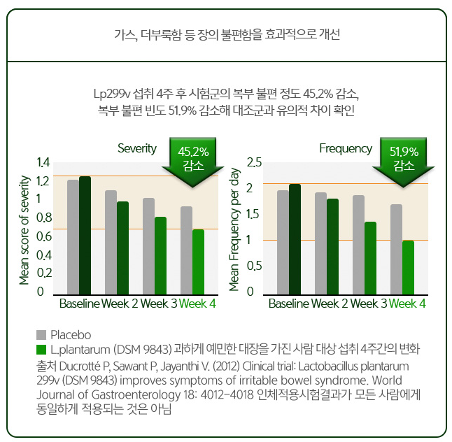 장 안쪽 벽에는 외부의 물질을 받아들이는 수용체가 존재하는데요, 우리가 섭취한 유산균이 장 내 정착하고 증식하기 위해서는 어떤 수용체와 결합하는지가 중요하다고 해요! 락토바실러스 플란타럼 299v 균주는 세계적으로 장 내 상피 흡착 특성을 인정받아 유익균들이 잘 정착할 수 있는 환경을 만들어준다고 합니다. 아래 자료는 Lp299v의 인체적용시험 결과로 가스, 더부룩 함 등의 장의 불편함이 효과적으로 개선되는 것을 확인할 수 있었습니다!