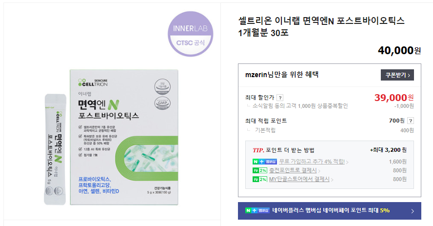 셀트리온 면역N 포스트바이오틱스는 현재 셀트리온 스킨큐어 공식 홈페이지에서 30포 기준으로 40,000원에 판매하고 있었어요!