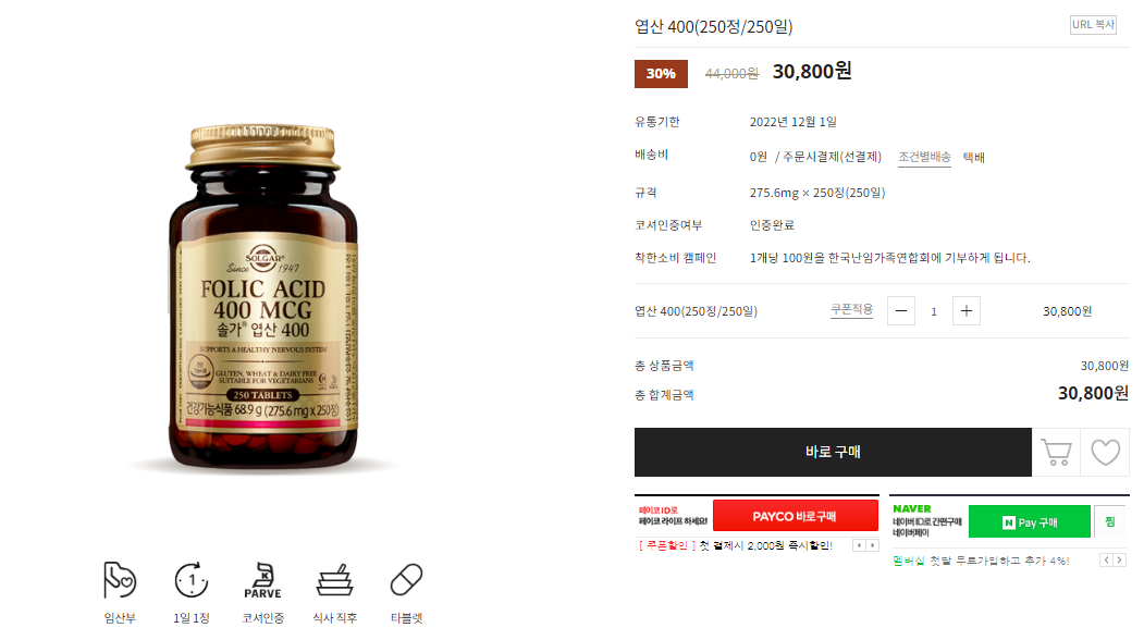 솔가 엽산 400은 현재 솔가 공식몰에서 250정 기준으로 30% 할인된 가격인 30,800원에 판매하고 있었어요!