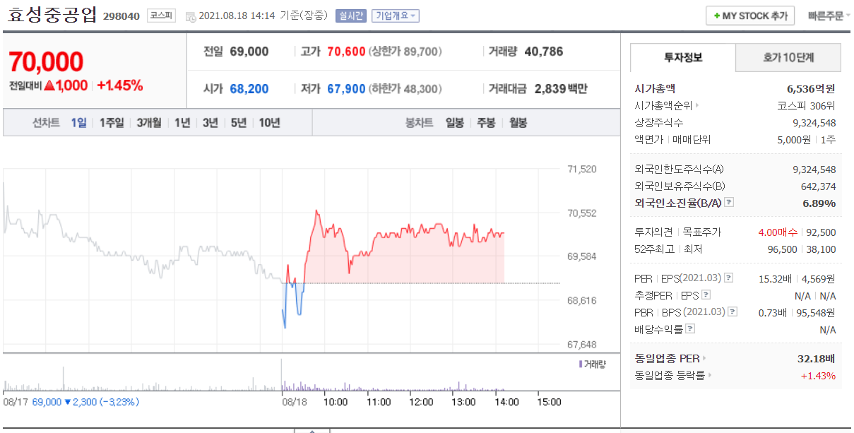 수소 관련주 효성중공업은 2018년 재상장되었고 변압기나 차단기, 생산설비에 필요한 기어나 전동장치들을 만들어 판매하고 있는 기업입니다. 수소차 충전시스템을 최초로 국산화하였고, 국내 수소충전소 점유율 1위 기업입니다. 국내에서는 특히 중공업이나 전력사업 쪽 그중 송배전에 관련한 독보적인 위치를 점유하고 있어서 해외시장에서도 인정받는 기술을 가지고 있습니다.