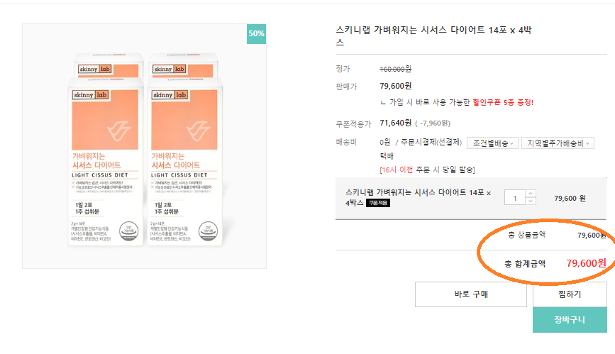 스키니랩 시서스 다이어트는 현재 스키니랩 공식홈페이지에서 14포 x 4박스 기준으로 79,600원에 판매중이었어요!