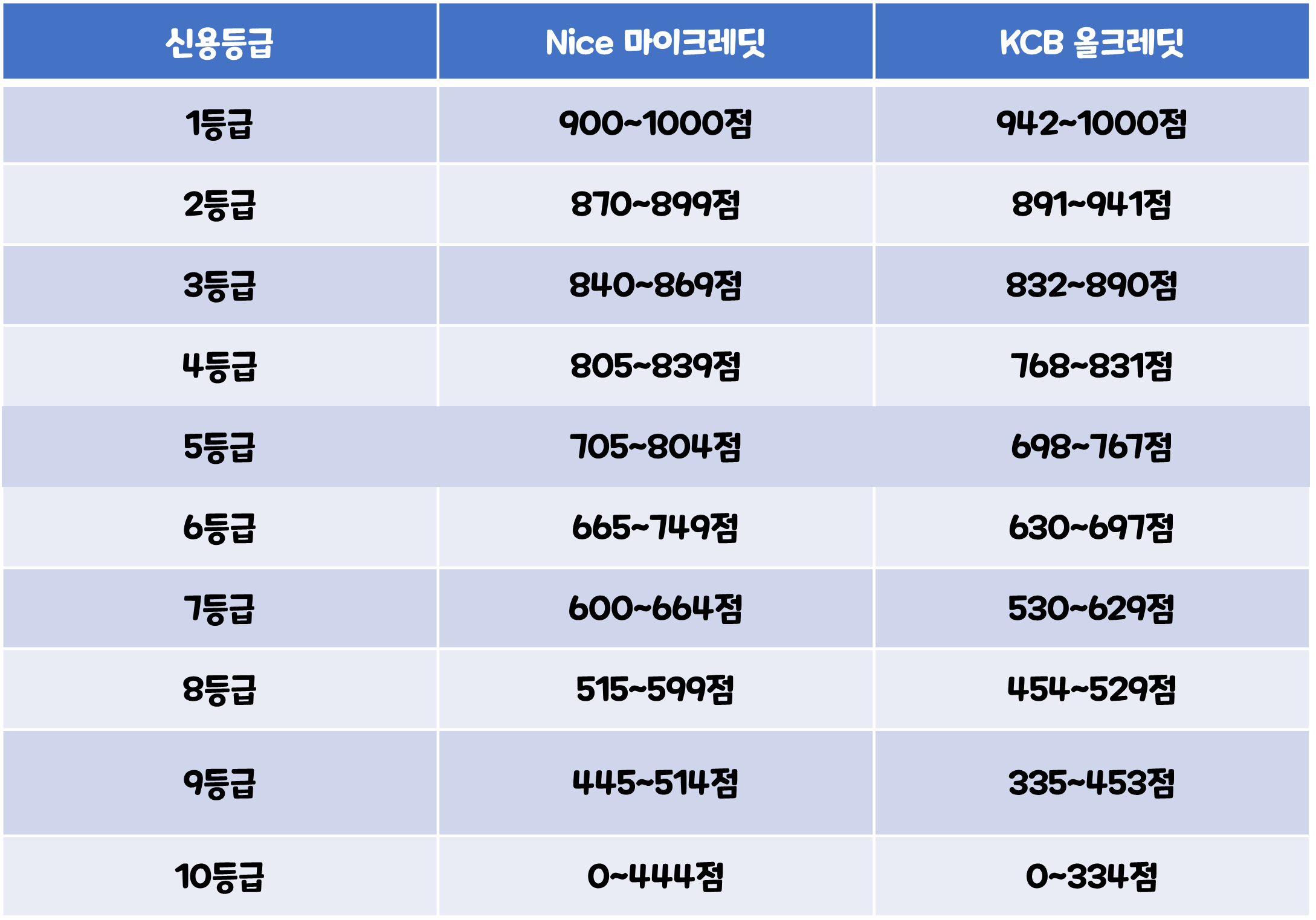 제도가 바뀐지 얼마 되지 않아서 과거의 신용등급제와 현재의 신용점수제의 비교를 위해서 아래 표로 정리해보았습니다. 이제는 금융거래에 있어서 등급이 아니라 신용점수가 기준이 되기 때문에 억지로라도 익숙해져야 할 것 같습니다.