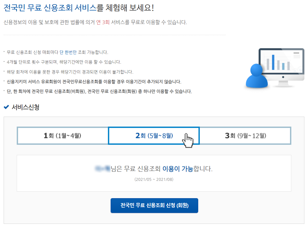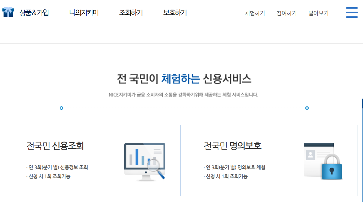 현재 NICE평가정보 나이스지키미에서는 1년에 3회 무료로 신용조회가 가능합니다.