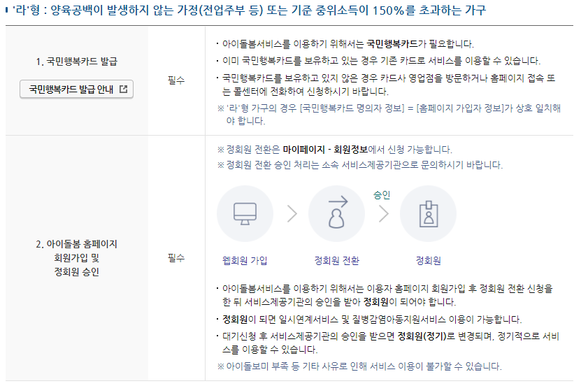 '가~다' 형에 해당하시는 경우 아이돌봄서비스 신청 전 정부지원 신청 및 접수를 하셔서 정부지원 결정통보를 받으신 후 서비스 이용이 가능합니다. 읍ㆍ면사무소 및 동주민센터에서 사회보장급여 신청을 하신 후 처리가 완료되면 국민행복카드를 발급받으시고, 아이돌봄 홈페이지에 회원 가입하셔서 서비스 신청 진행하시면 되겠습니다. '라'형은 정부지원 신청 없이 국민행복카드 발급 - 회원가입을 하신 후 서비스 신청하시면 됩니다.