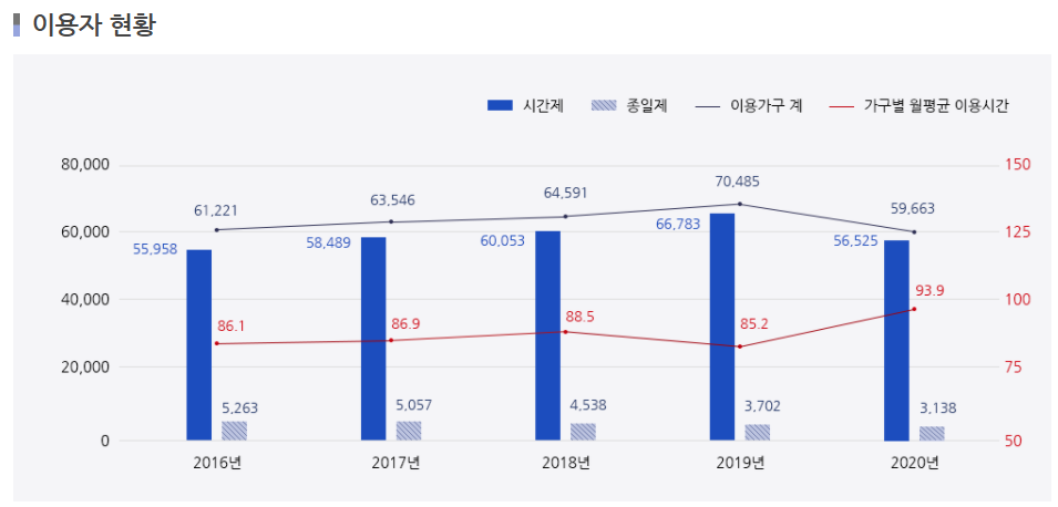 아이돌봄서비스란 만 12세 이하 자녀가 있고 맞벌이 등으로 양육 공백이 발생한 가정을 대상으로 아이돌보미가 직접 찾아가서 돌봄서비스를 제공하는 것을 말합니다. 이는 정부에서 지원하는 정책으로, 부모의 양육부담은 줄이고 시설보육의 사각지대를 보완하고자 마련된 정책이에요. 아이돌봄서비스는 아래와 같이 2020년 총 59,663 가정이 이용하고 있는데요, 시간제 서비스와 영아종일제 서비스 등 여러 종류의 서비스를 지원하고 있습니다. 아래에서 더욱 자세히 알아보도록 하겠습니다.