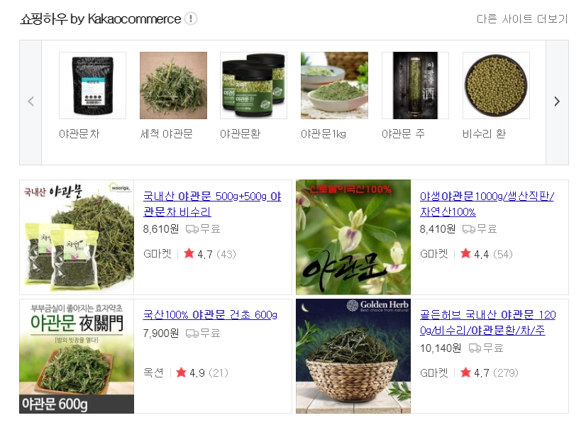 야관문은 온라인 상에서 쉽게 구매하실 수 있습니다. 네이버나 다음과 같은 포털사이트에 검색하시면 되는데요 제가 알아본 야관문의 가격은 600g에 6~7천원 대의 가격이 형성 되어있었어요!