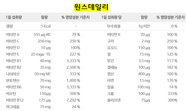 과거에는 과일이나 채소의 풍부한 영양분으로 영양소를 섭취했지만 현재에는 과거와 똑같은 양의 과일과 채소를 섭취했을 때 얻는 영양소가 거의 절반이라고 생각하시면 됩니다. 그렇기 때문에 비타민 영양제를 통하여 부족한 영양소를 섭취하는 것이 좋습니다. 우리가 섭취해야 되는 영양소는 너무나도 다양하기 때문에 각각 다른 종류의 비타민을 모두 구매해서 섭취하는 것은 여간 번거로운 일이 아니에요. 그래서 다양한 영양소 섭취를 위해 제가 추천드리는 것은 멀티비타민입니다!